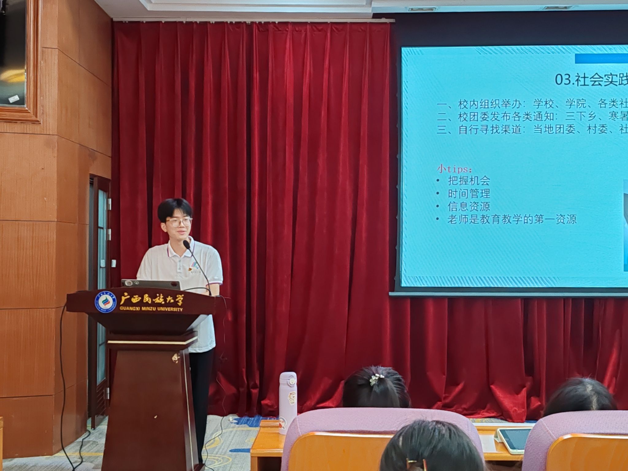 分享会上,5位同学就各自在专业学习、学术科研、社会实践、创新创业等方面取得显著成绩的优秀学生分别上台发言,他们不仅分享了自己在学习和生活中的经验和感悟,还提供了许多实用的学习方法和时间管理技巧。