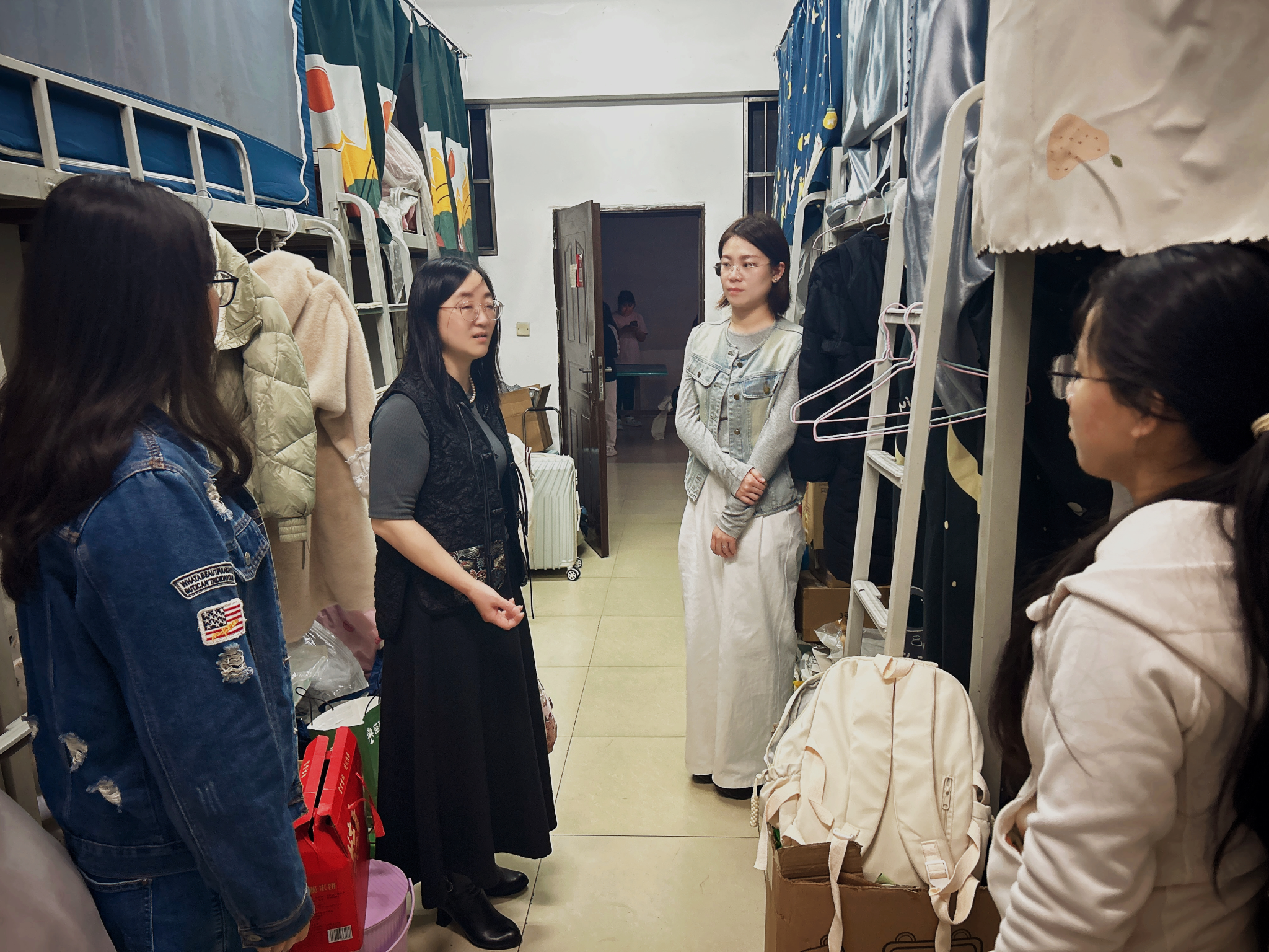 检查组针对南方春季潮湿多雨的气候特点,重点排查电煮锅、除湿机、电热毯等易引发短路的大功率电器使用情况,对插排串联、床帘遮挡电源等安全隐患进行现场整改。在走访过程中,邹同霞副书记与学生亲切交流,详细询问同学们的生活状况,特别关注考研复试、就业实习等重点群体需求,鼓励同学们养成“人走断电”的良好习惯,建立积极健康的生活方式。