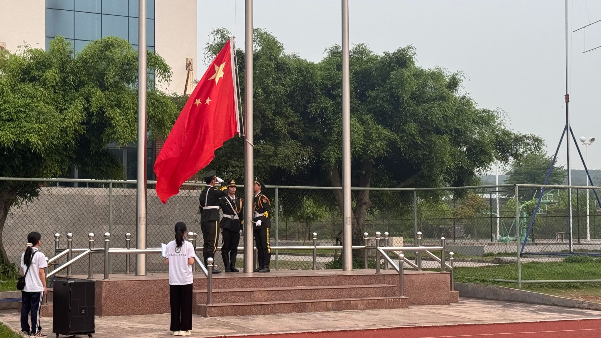 护旗方队步伐铿锵,雄壮国歌响彻校园,鲜艳的五星红旗迎风飘扬,沐浴着晨光冉冉升起。学生和老师们歌声嘹亮,“我们万众一心,冒着敌人的炮火,前进,冒着敌人的炮火,前进!前进!前进!进!”,校园回荡着慷慨激昂的旋律,表达着对祖国的热爱和敬仰,每一个人都深深感受着身体里铿锵跳动的心脏和仿佛沸腾的热血。