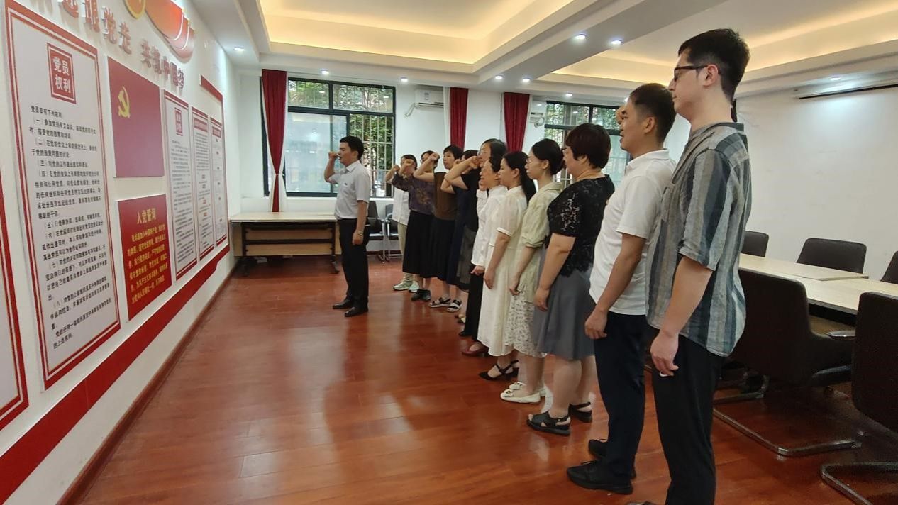 仪式上,伴随着庄严的国歌声,教科院全体教职工党员肃立,面向党旗,举起右手,由韦焕贤书记带领宣誓,重温了那铿锵有力、饱含深情的入党誓词。“我志愿加入中国共产党,拥护党的纲领,遵守党的章程......随时准备为党和人民牺牲一切,永不叛党。”每一个字、每一句话都让教师党员们进一步坚定了理想信念,这不仅是对入党时那份庄严承诺的回顾,更是对自我精神的深刻检阅。通过重温入党誓词,全体党员表示,将以更加昂扬的斗志,更加坚定的步伐,跟随党走,扎实工作,为实现中华民族的伟大复兴不懈奋斗。