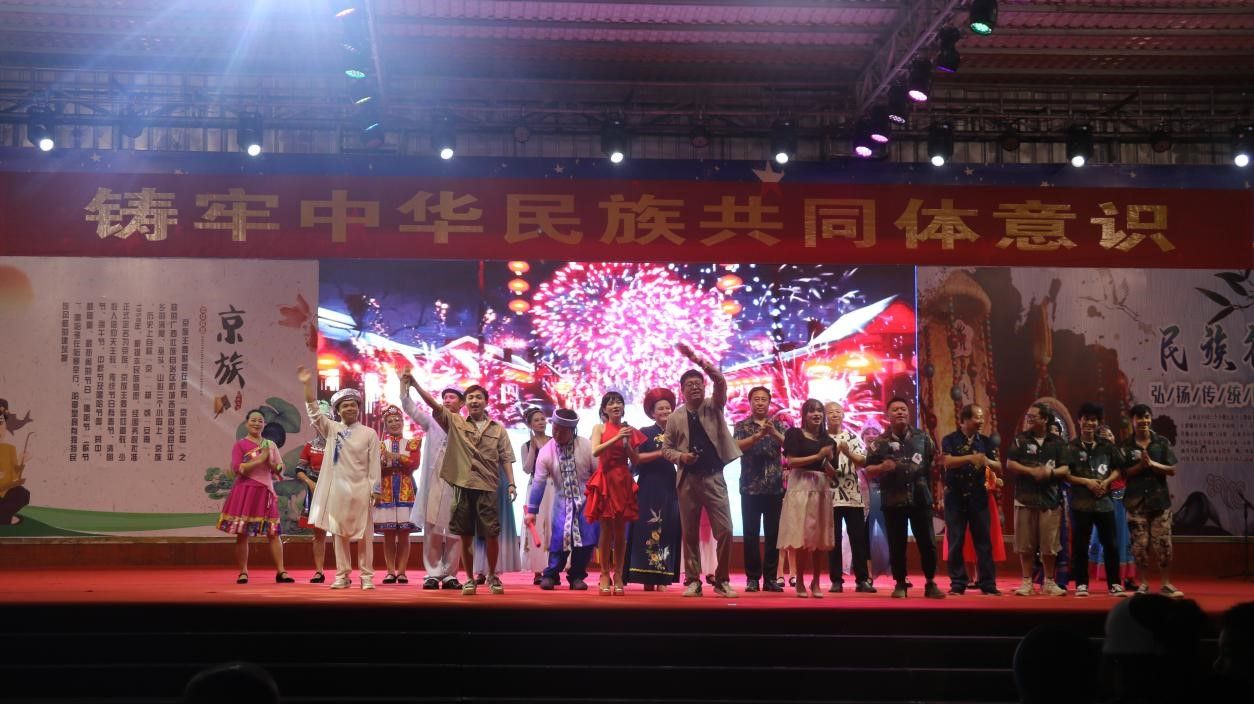 华灯初上,同日晚上,一场精彩纷呈的京族文化汇演在东兴金滩民族大舞台开展,舞台下座无虚席,给现场观众带来了一场震撼心灵的视听盛宴。晚会的出场节目是由京族小伙们组建的乐队,演唱《夜空中最亮的星》,开场曲瞬间点燃了观众的热情,紧接着哈哥哈妹们身穿绚丽的京族服饰,伴着京族歌曲,踏着轻快的节奏,翩翩起舞。舞者们将京族特色元素与现代元素相结合,用曼妙的舞姿和动人的歌声,向游客展示了京族人民的热情奔放和对生活的热爱,并让更多的人了解和喜爱京族文化,促进了京族传统文化的传承,赢得了人们热烈持久的掌声!各族人民通过同庆哈节活动增进彼此间的情谊,助力中华民族共同体意识建设。