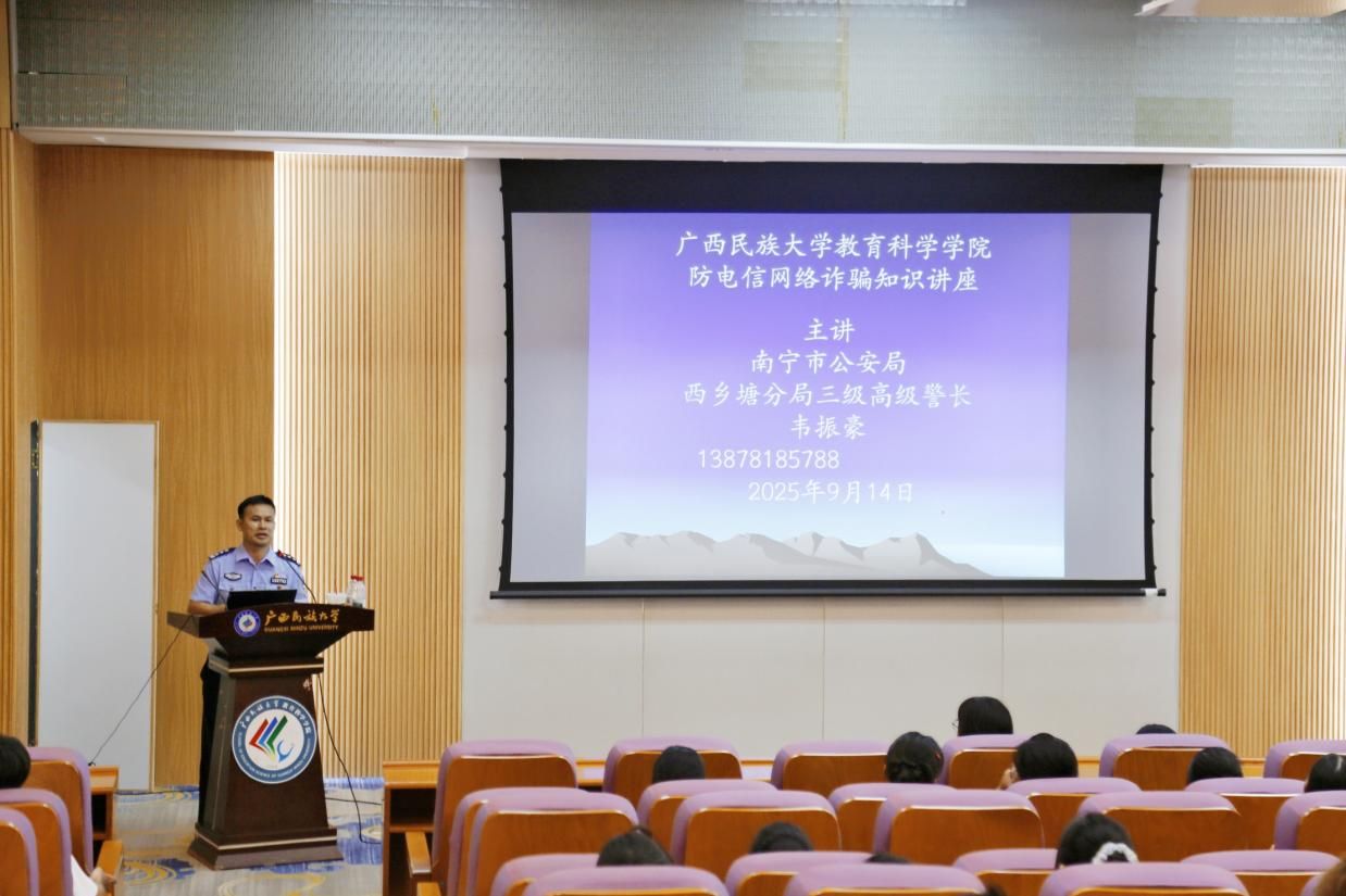 而在安全教育方面,学校特别邀请韦振豪警官带来专题讲座,其讲座重点聚焦于防电信网络诈骗、意识形态安全等。韦警官结合大量真实案例,剖析了“虚假校园贷”“冒充师生诈骗”“兼职刷单陷阱”等常见的电信诈骗手段,为同学们揭示了诈骗分子的套路。他还传授防范技巧,如不轻易泄露个人信息、遇到可疑情况及时向学校保卫处或警方求助等,切实增强了新生的安全防范意识与自我保护能力。