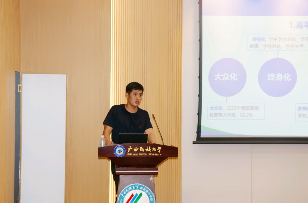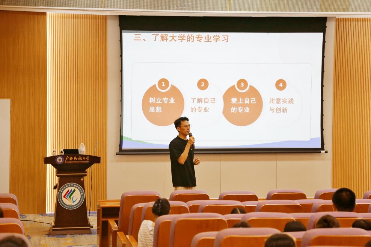 在高等教育认知与地方文化浸润方面,陆宇扬从多维度展开讲解:一方面从高等教育概述、我国高等教育、广西高等教育、高等教育的核心理念及发展趋势中让新生系统地认识高等教育体系,为后续专业深造和职业发展建立宏观认知;另一方面,深入介绍学校历史、院史、区情及广西文化,让新生从校园底蕴到地域文化,全方位感知广西民族大学与广西的联系,理解高等教育在地方文化传承与发展中的使命,助力新生更快融入校园、扎根广西。