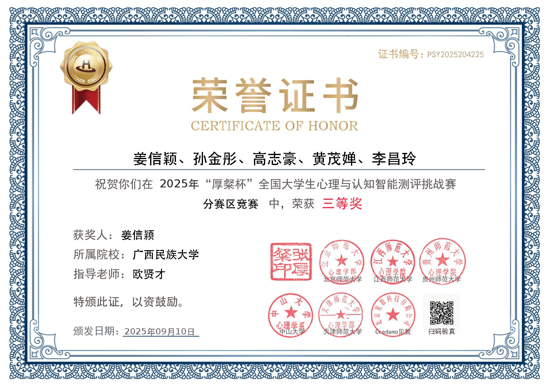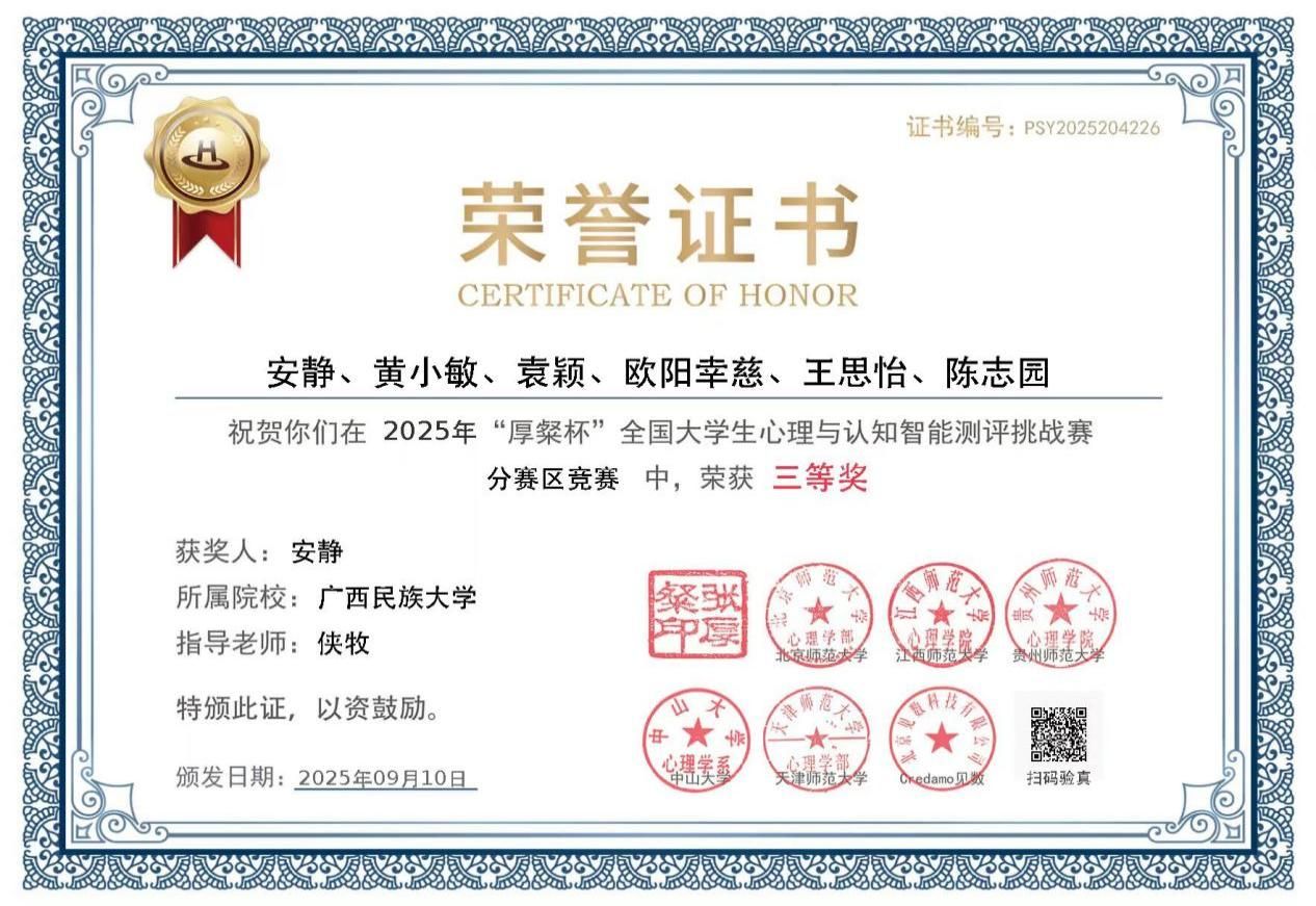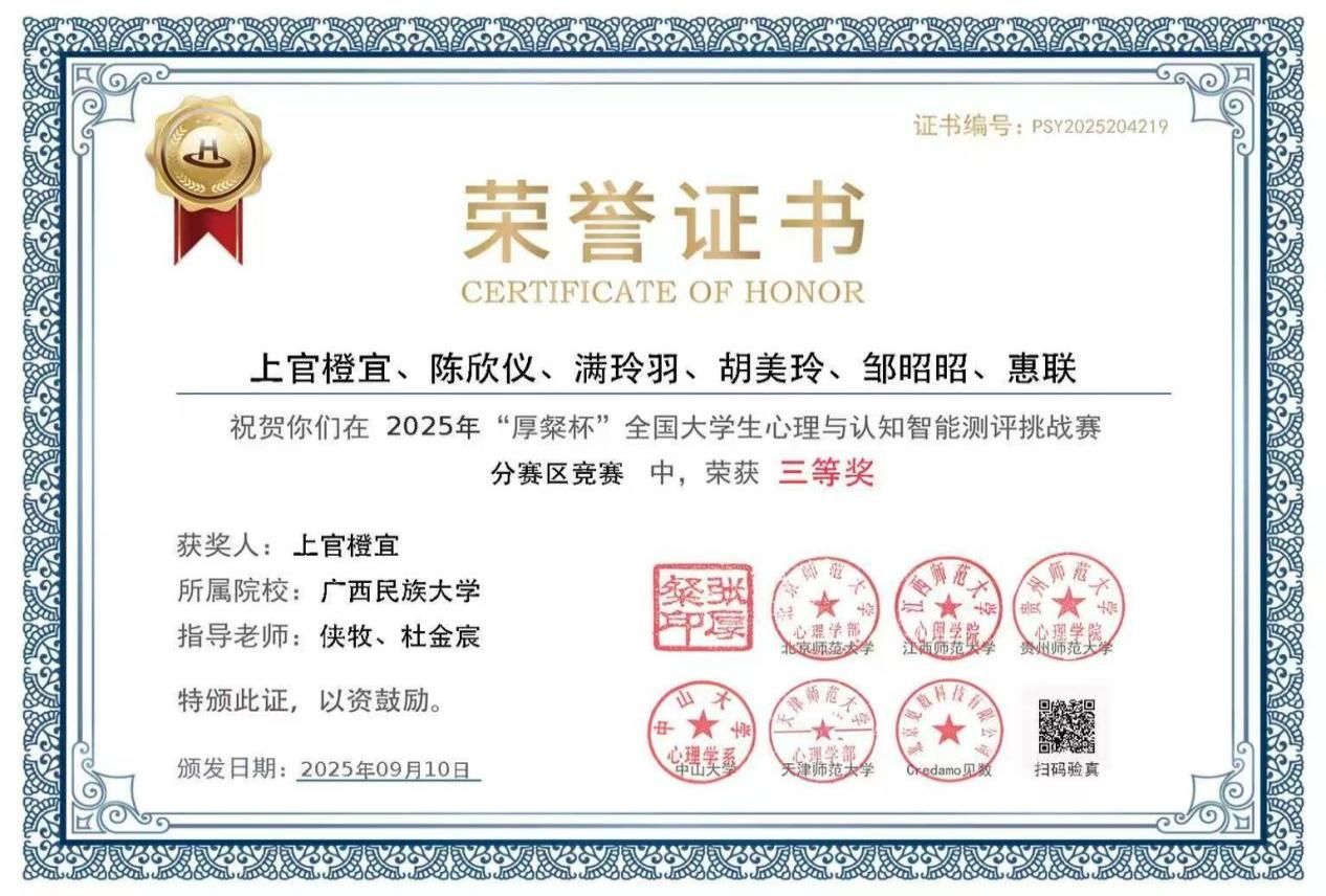 必威西汉姆联官网在首届“厚粲杯”全国大学生心理与认知智能测评挑战赛中喜创佳绩