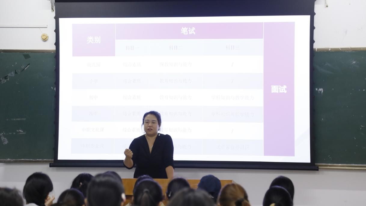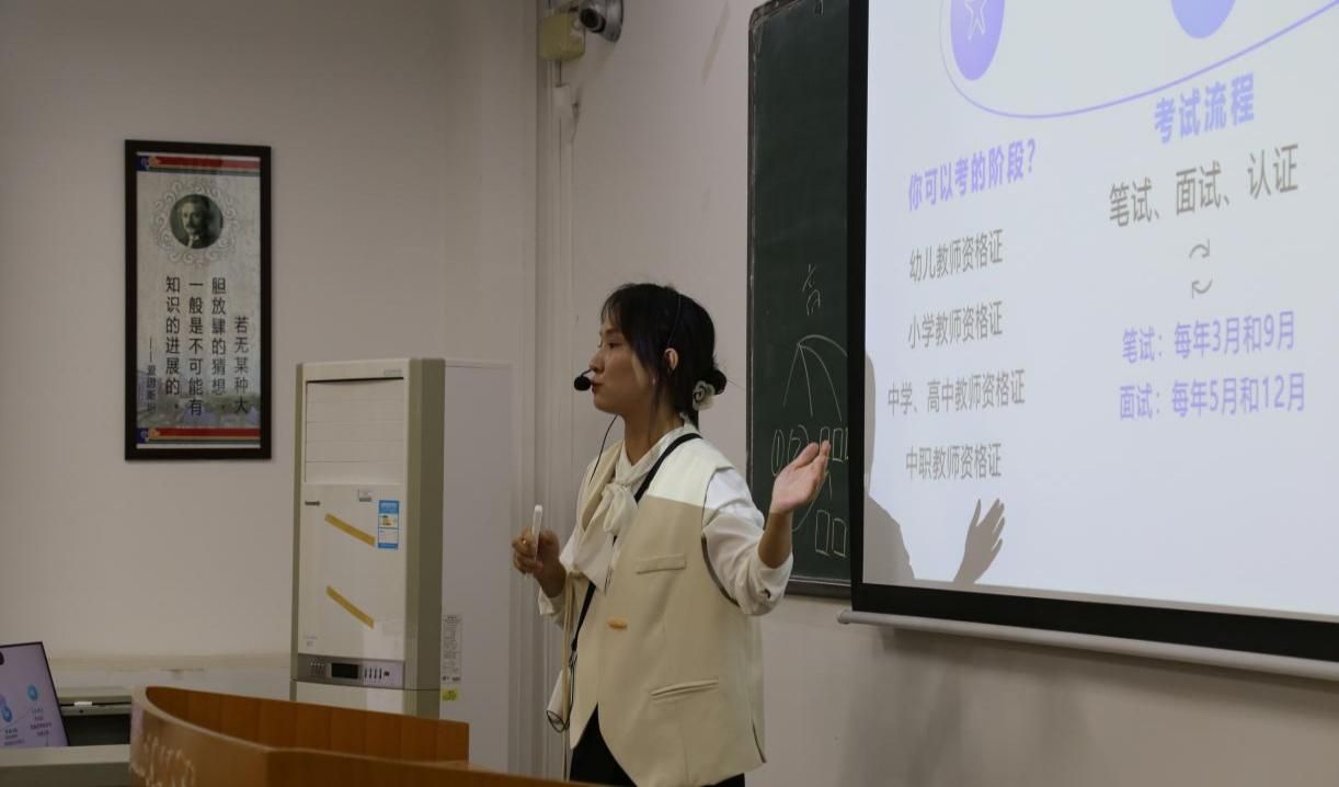 讲座中,主讲人围绕师范类专业核心职业资格证书,如幼儿教师资格证、小学教师资格证、中学及高中教师资格证、中职教师资格证展开讲解。从报考条件、考试流程、备考策略、证书价值等维度进行详尽阐释,其中明确教师资格证笔试每年 3 月和 9 月举行,面试每年 5 月和 12 月举行。同时,主讲人结合教育行业就业趋势,为同学们梳理不同阶段的考证规划。在互动环节,主讲人针对同学们提出的备考时间安排、科目选择等问题逐一解答,助力学生明晰学习方向。
